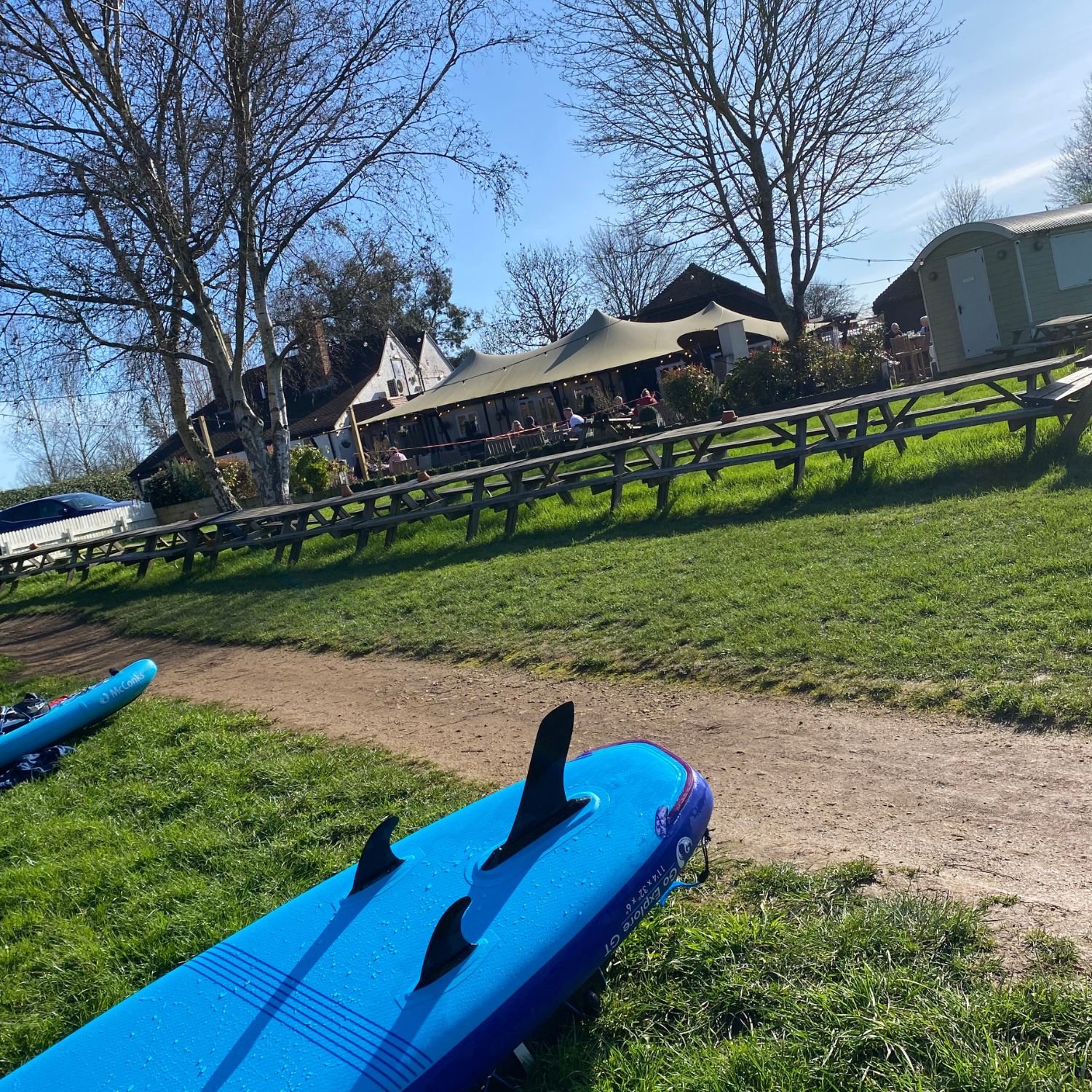 Part of the joy of paddleboarding is being able to stop whenever you find a beautiful spot. We had packed some snacks - boiled eggs from the wonderful Riverside chucks, cereal bars and fruit - and paused at one of the many locks to enjoy some sunshine with our picnic. Having left the thermos behind (deliberately?) It was essential to source a drink from the Rowbarge pub (Woolhampton), on the bank of the canal, and one of many possible pub or cafe stops along the way.